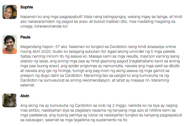 Sa nakaraang ilang taon, nagkaroon ako ng paggamot sa sanatorium ng Manila. Pananaliksik para sa bagong remedyo para sa hindi regular na presyon ng dugo ay ginawa doon. Talaga, natatakot ako noon. Ngunit ano ang maaari kong gawin? Walang ibang remedyo ang nakatulong sa akin kaya nagpasya akong subukan. Sa kasuwertehan, napasama ako sa grupo na kumuha ng Сardioton, at hindi ang placebo. Makalipas ang dalawang oras, naging normal ang presyon ko. Dahan-dahan, nagsimulang humusay ng malaki ang aking pakiramdam! Nagagalak ako na napasama ako sa pagsubok na remedyo noon. Palagi nang maayos ang aking AP ngayon.