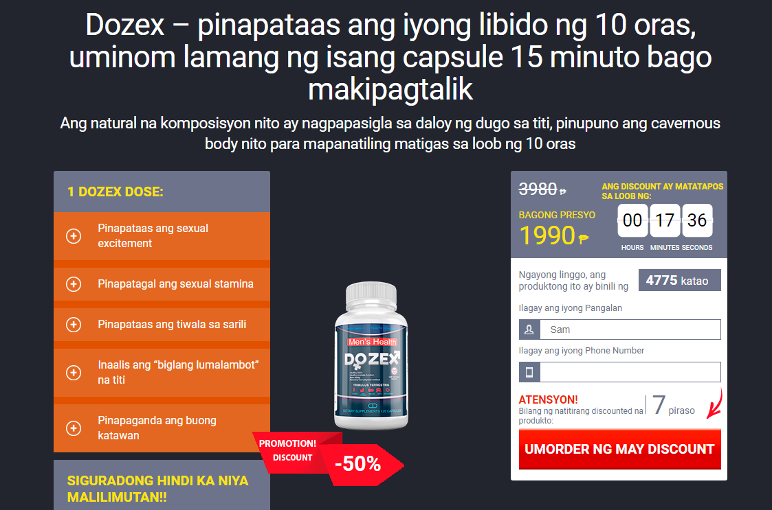 Dozex pinapataas ang iyong libido ng 10 oras, uminom lamang ng isang capsule 15 minuto bago makipagtalik. Dozex Ang natural na komposisyon nito ay nagpapasigla sa daloy ng dugo sa titi, pinupuno ang cavernous body nito para mapanatiling matigas sa loob ng 10 oras.