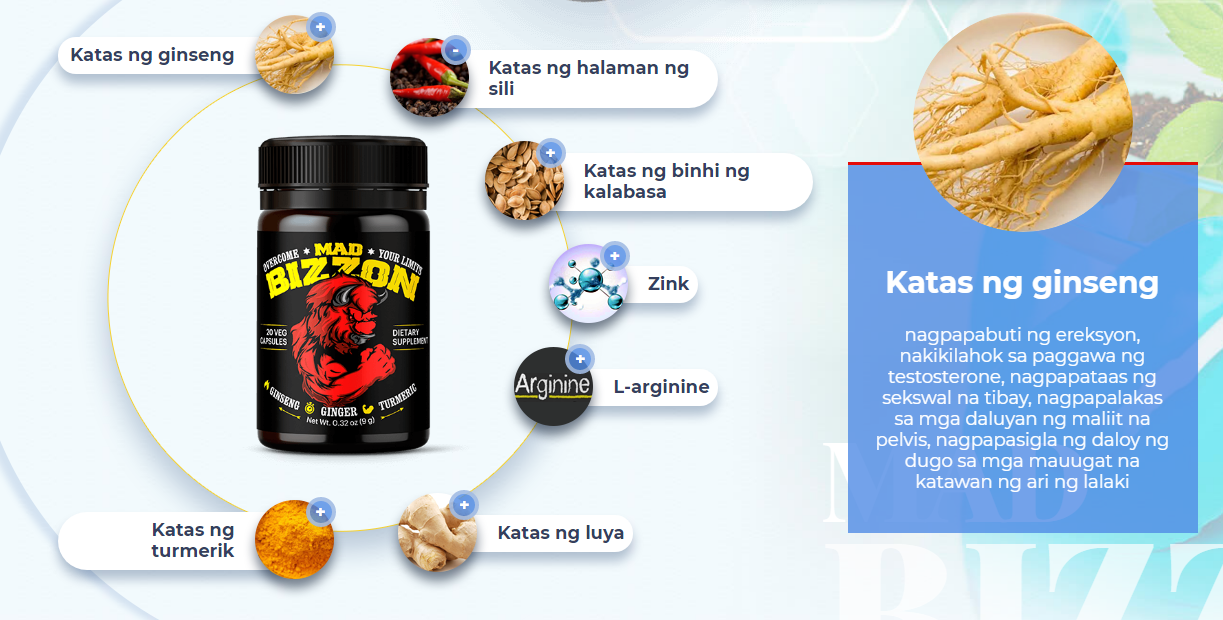MGA SANGKAP NG MAD BIZZON7 pinakamakapangyarihang pampalakas sa seks sa 1 kapsula. Ang mga katas ng halaman na ginamit sa Mad Bizzon ay natanggap sa pamamagitan ng pamamaraan na malamig na pagpindot (cold press sa Ingles), salamat dito dahil ang lahat ng mahahalagang sangkap ay ganap na napanatili: