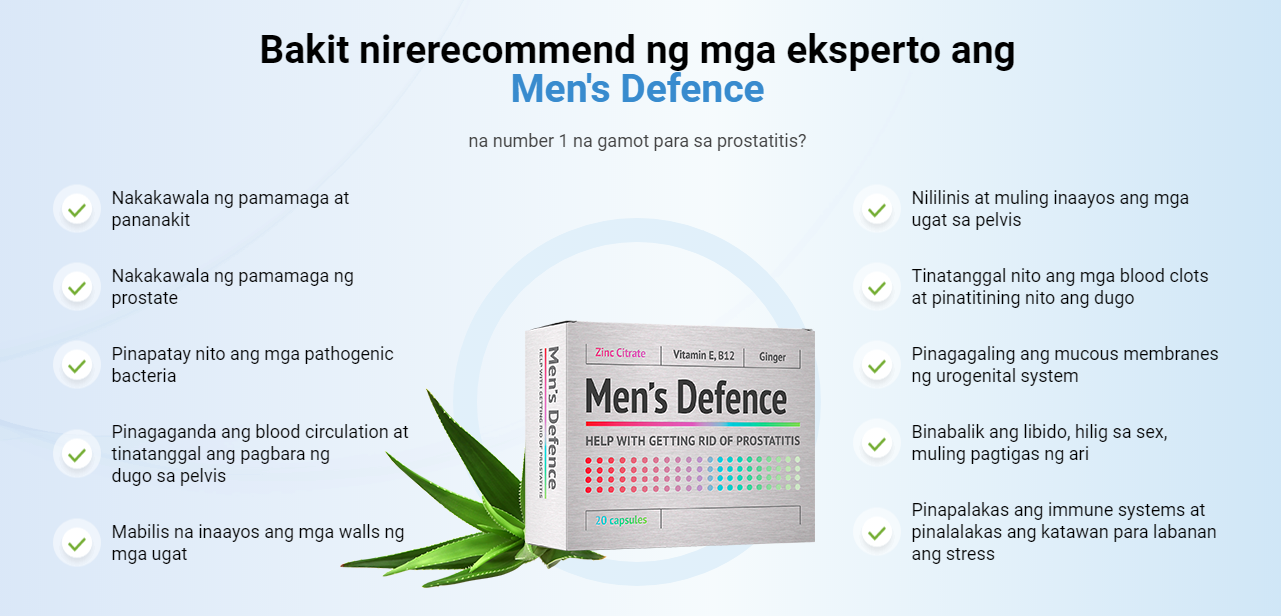 Mayroon itong anti-inflammatory, antioxidant and vessel-strengthening na sangkap. Ang Men's Defence ay nagbibigay para muling ma-restore ang microcirculation ng mga tissues ng prostate gland, resulta, ang mga organ ay magiging malusog at magiging fully restored.