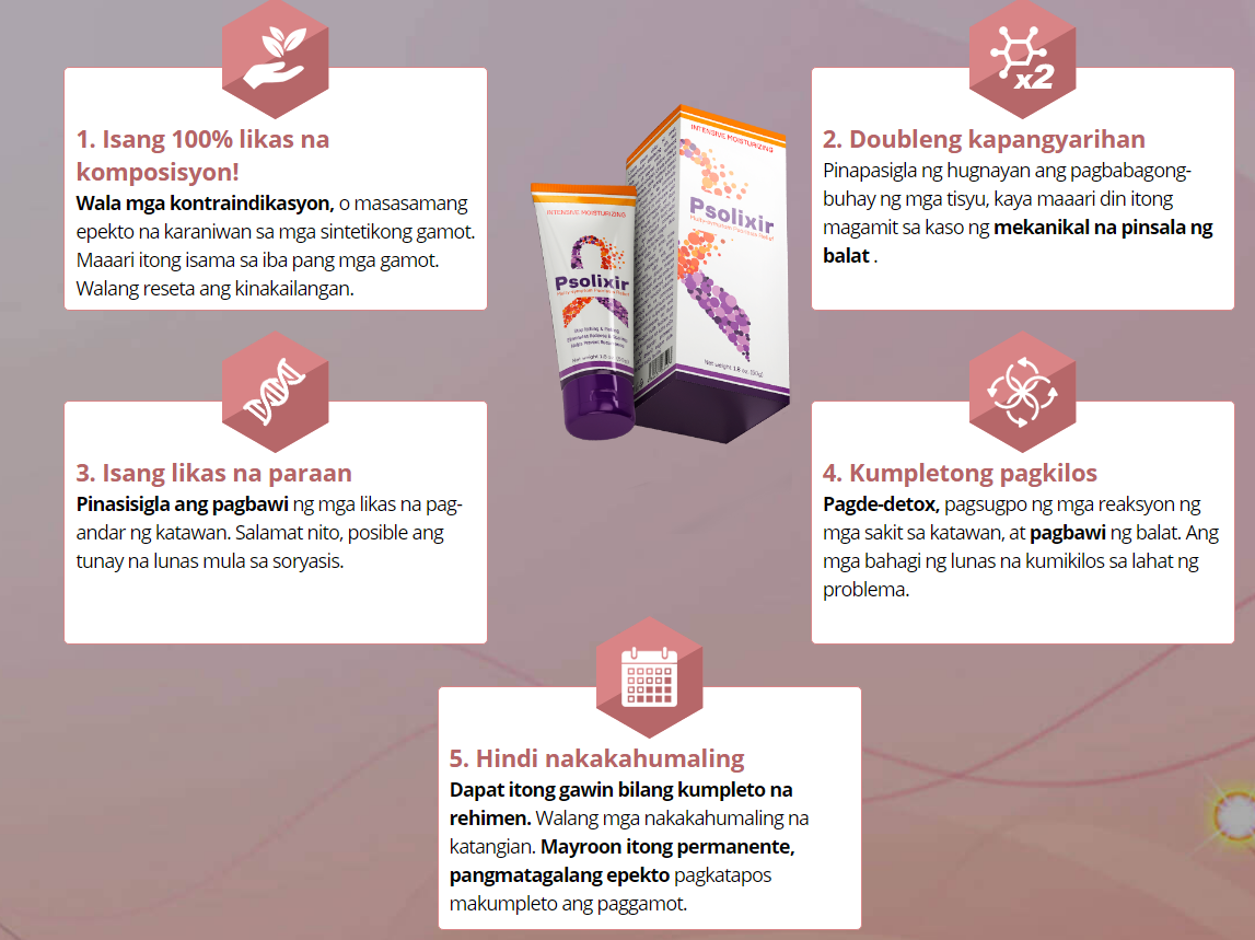 Psolixir – isang mabisang lunas para sa soryasis, na nilikha sa ang batayan ng mga natural na mga sangkap. Produkto ay nagbibigay ng mabilis na cell pagbabagong-buhay, na kung saan ay nagsisiguro mabilis na kaluwagan mula sa sakit. Ang pagkawasak ng microorganisms pathogenic dahil sa ang mga bahagi na may antibacterial properties, dagdagan ang kaligtasan sa sakit.