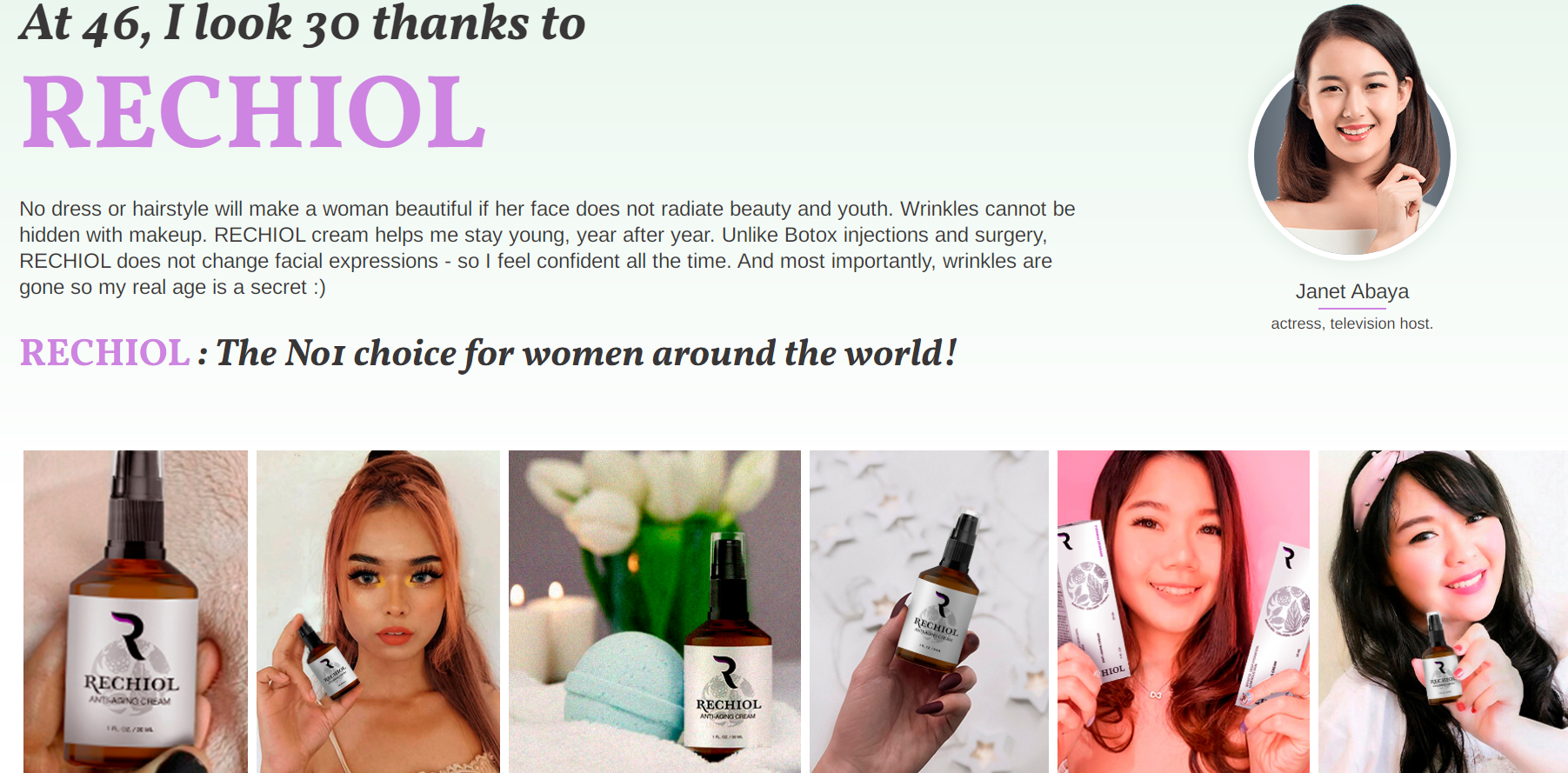 Mabilis ang resulta sa pinayamang pormula ng Rechiol. Dahil umaabot sa mga selula ng balat, pinasisigla ng mga aktibong sangkap ng krema ang metabolismo ng selula. Napababata ang balat, at natatanggal ang mga kulubot at pigmentasyon.